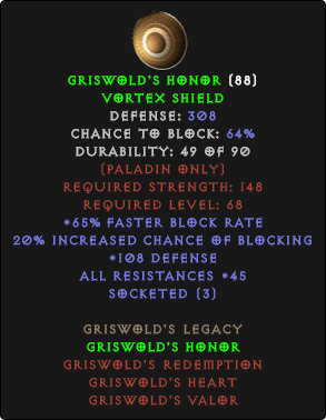 Tól től $1.75Variables:Base Defense: 310-369 Level 13-16 Defiance Aura When Equipped220-239% Enhanced Defense +35-44% All Resistances