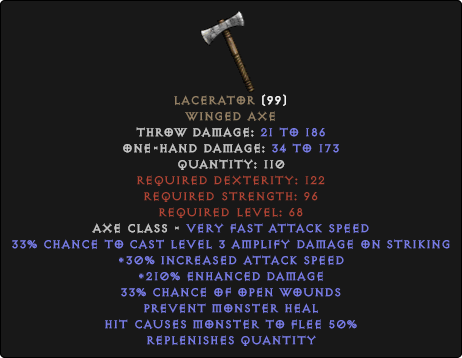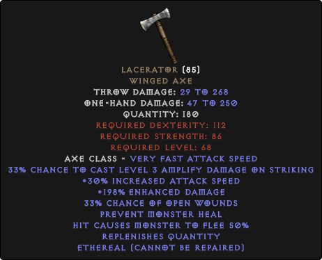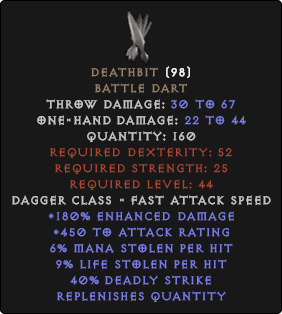 $0.28변수 : + 130-180% 강화 된 데미지 + 200-450 공격 등급 7-9% 적중 당 도난 당 4-6% 적중 당 마나 도용당하는자가 보충