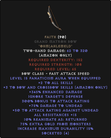 Acte I Les mercenaires peuvent équiper des arcs de foi tant que la base n'est pas réservée à Amazon. Cette version mercenaire est exclusivement utilisée pour la vitesse d’attaque accrue fournie par le Fanatisme Aura - sinon, un Acte II pourrait avoir plus de dégâts améliorés. La construction standard pour ce mercenaire est: