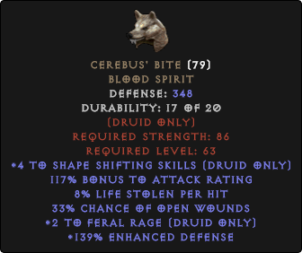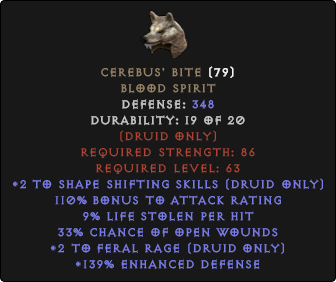CEREBUS & #8217; BITE (86) VÉR SZELLEM VÉDELEM: 348 Tartósság: 20-án 14-én (CSAK DRUID) SZÜKSÉGES SZERKEZÉS: 86 SZÜKSÉGES SZINT: 63 +2 VÁLTOZÁSI KÉSZSÉGEK KISZERELÉSE (CSAK DRUID) 119% BÓNUSZ, HOGY A TÁMOGATÁS MÉRTÉSE 9% LIFE STOLEN PER HIT 33% A NYITOTT SZEREK ELLENŐRZÉSE +1 FERAL RAGE (CSAK DRUID) + 139% Fokozott védelem