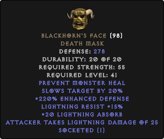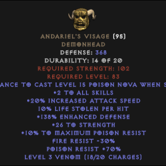 ANDARIEL & #8217; S VISAGE (88) DEMONHEAD VÉDELEM: 323 Tartósság: 20-án 13-án SZÜKSÉGES SZERKEZÉS: 102 SZÜKSÉGES SZINT: 83 15% VÁLTOZTATÁSA A HEGYSÉG SZINTÉRE 15 MÉRGEZŐ NOVA, Mikor STRAKCIÓK +2 MINDEN KÉPESSÉGRE + 20% NINCS NÖVELETT TÁMOGATÁSI SZÁM 10% LIFE STOLEN PER HIT + 109% Fokozott védelem +30 A SZERINT + 10% A maximális mérgező ellenállás TŰZÁLLÓ -30% Mérgező anyag ellenállóképesség + 70% 3. SZINT VENOM (20/20 DÍJ)