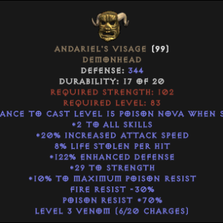 ANDARIEL & #8217; S VISAGE (87) DEMONHEAD VÉDELEM: 382 Tartósság: 20-án / 15-én SZÜKSÉGES SZERKEZÉS: 102 SZÜKSÉGES SZINT: 83 15% VÁLTOZTATÁSA A HEGYSÉG SZINTÉRE 15 MÉRGEZŐ NOVA, Mikor STRAKCIÓK +2 MINDEN KÉPESSÉGRE + 20% NINCS NÖVELETT TÁMOGATÁSI SZÁM 8% LIFE STOLEN FENNT + 147% Fokozott védelem +25 A SZERINT + 10% A maximális mérgező ellenállás TŰZÁLLÓ -30% Mérgező anyag ellenállóképesség + 70% 3. SZINT VENOM (17/20 DÍJ)