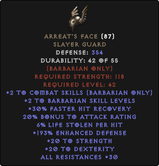 ARREAT & #8217; S FACE (95) VÉDŐ VÉDELEM: 363 Tartósság: 55 55 közül (CSAK BARBÁR) SZÜKSÉGES SZERKEZÉS: 118 SZÜKSÉGES SZINT: 42 +2 A KÉSZSÉGEK KORLÁTOZÁSÁRA (CSAK BARBÁR) +2 A BARBARI ÜZEMELTETÉSI SZINTEKHEZ + 30% GYORSabb HIT-VISSZATÉRÍTÉS 20% BÓNUSZ az osztályozás megújításához 4% LIFE STOLEN PER HIT + 200% Fokozott védelem +20 AZ ERŐSÍTÉSHEZ +20 SZAKOSSÁGRA MINDEN ellenállás +30