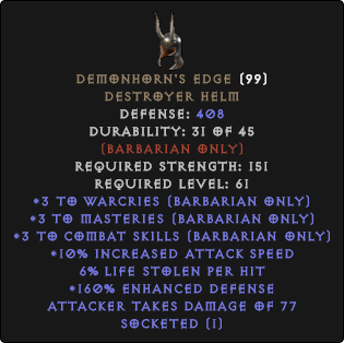 DEMONHORN & #8217; S EDGE (94) DESTROYER HELM VÉDELEM: 524 Tartósság: 23-án 23-án (CSAK BARBÁR) SZÜKSÉGES SZERKEZÉS: 141 SZÜKSÉGES SZINT: 61 +2 WARCRIES (CSAK BARBÁR) +3 MŰVÉSZETEKHEZ (CSAK BARBÁR) +3 KÉPESSÉGEK KERELÉSE (CSAK BARBÁR) + 10% NINCS NÖVEKEDÉSI HATÁS 3% LIFE STOLEN HIT + 123% Fokozott védelem A CSATLAKOZÓ 65 ETHERE (nem javítható)