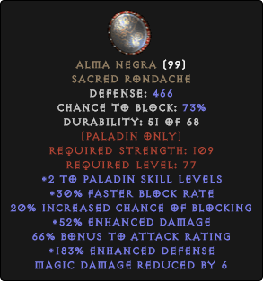 Variabels: +180-210% Enhanced Defense +1-2 to Paladin Skills +60-75% Enhanced Damage 40-75% Bonus to Attack Rating Magic Damage Reduced By 5-9 Ethereal (+50% base defense)