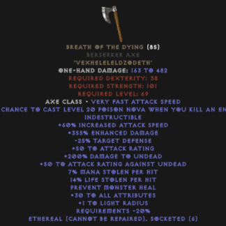 This leads to the conclusion Breath of the Dying is best used as an Act II mercenary weapon for builds that do not rely on Infinity, Pride or The Reaper’s Toll and who do not want to shatter corpses (Goldfind Barbarians, Bone Necromancers etc.) The following are effective end-game setups: