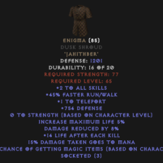 Энигма является неоспоримо наиболее игрой-коробление вещи в Diablo II. Более 90% сборок используют Enigma по умолчанию, а остальные 10%, вероятно, будут работать лучше, если они переключатся. Teleport Oskill невероятно мощен как в PvM, так и в PvP, и он полностью меняет характер игры.