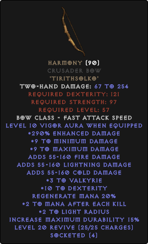 Гармония - это очень дешевый Runeword, который часто делается для нахождения магии. Обычно он используется в качестве переключателя оружия для персонажей, которые хотят быстро бегать и не нуждаются в призыве к оружию. Аура Энергии, которую обеспечивает Гармония, наиболее эффективна для коротких MF-маршрутов, которые включают бег через город (Pindleskin, Shenk + Eldritch, Travincal Council). Уровень 10 Vigor увеличивает скорость передвижения на 36%.